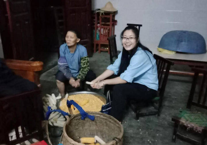 黄文秀生前到村民家访问时,帮村民掰玉米(贵府图)。新华社发“大山的儿子”黄文秀