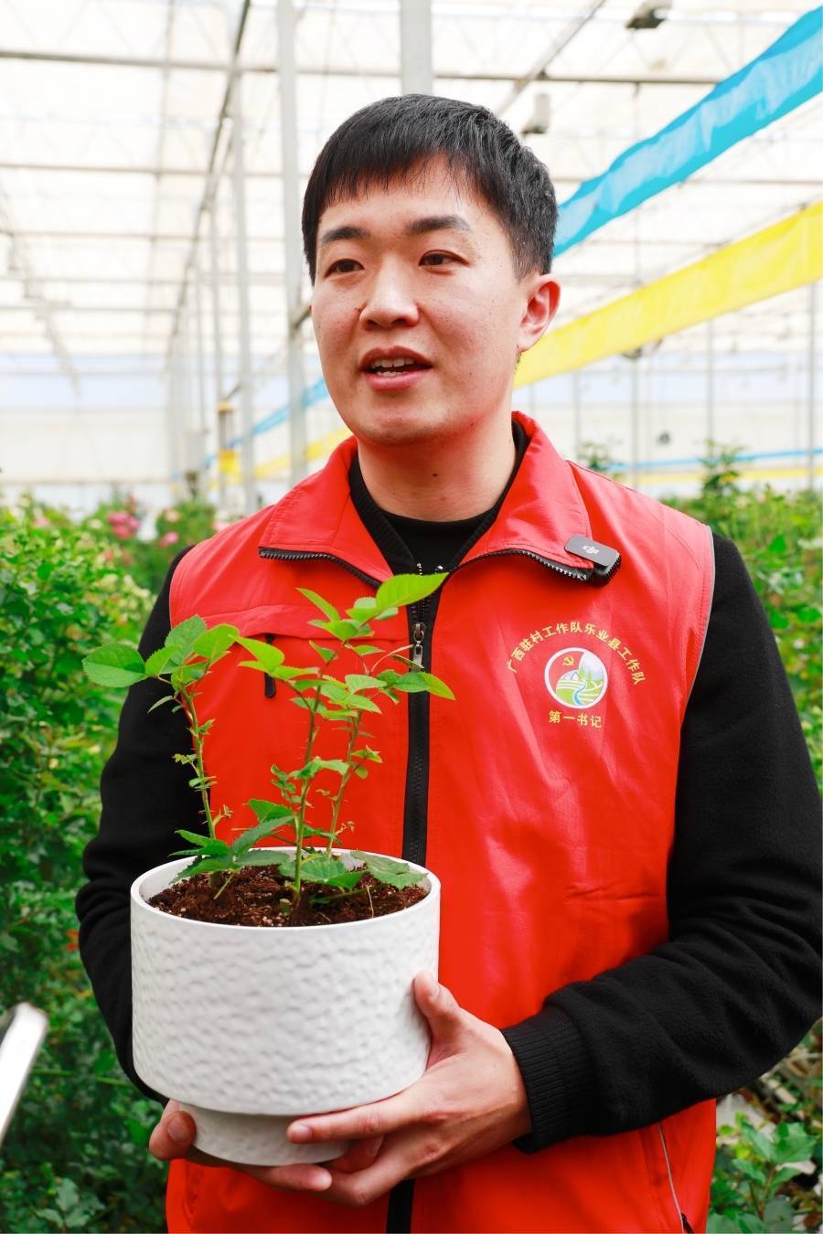 中共百色市委宣传部派驻百坭村第一通告陈竑任手捏“文秀”月季花苗(3月18日摄)。新华网 赵普凡 摄“‘文秀’月季定名后,